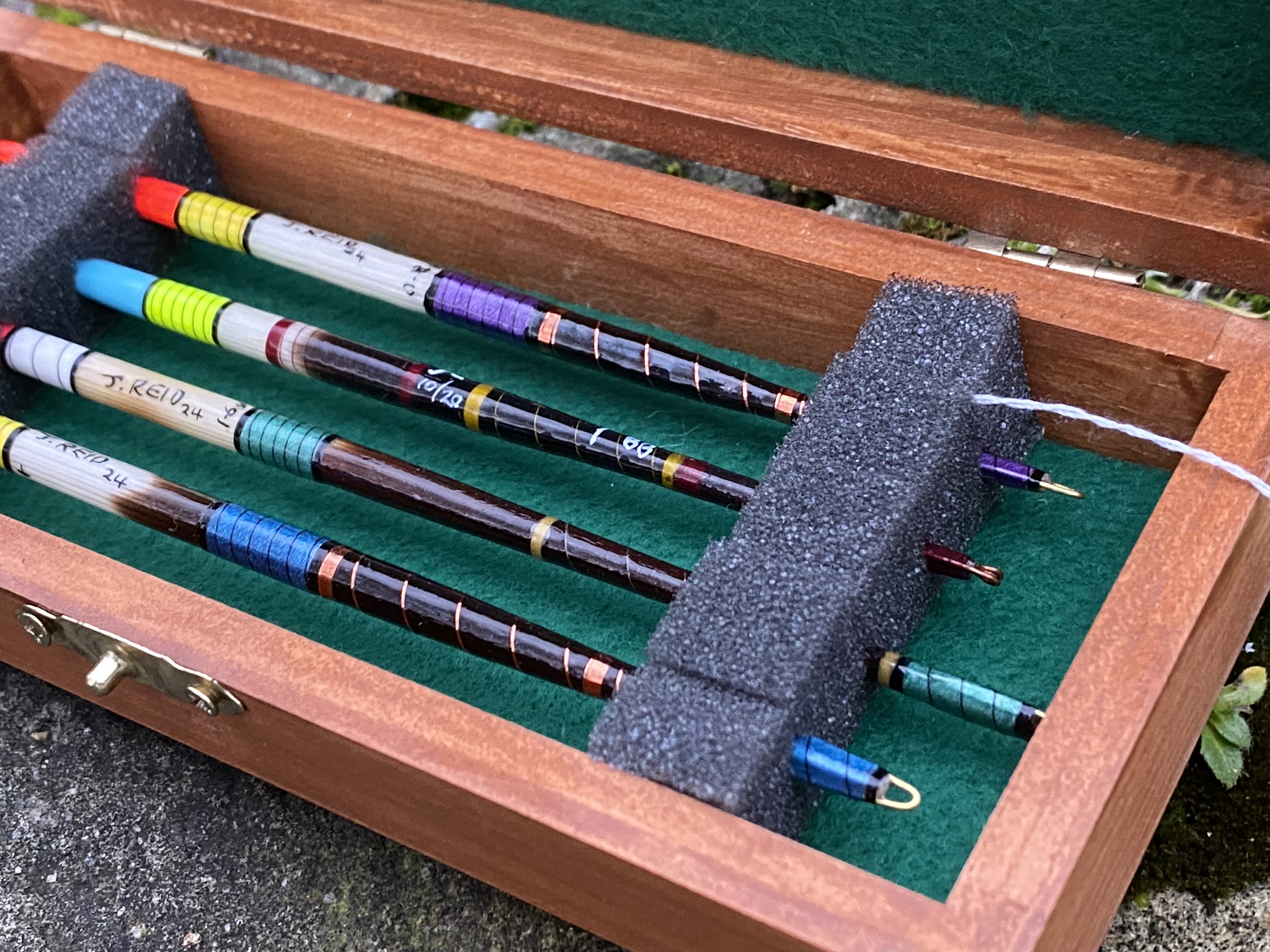 These floats are made from porcupine quills, the tips painted fluorescent red, pink, orange and blue over yellow and white. Next, I have dressed and lined them with silk, metallic and copper thread, finally they have a minimum of 10 coats of lacquer.
