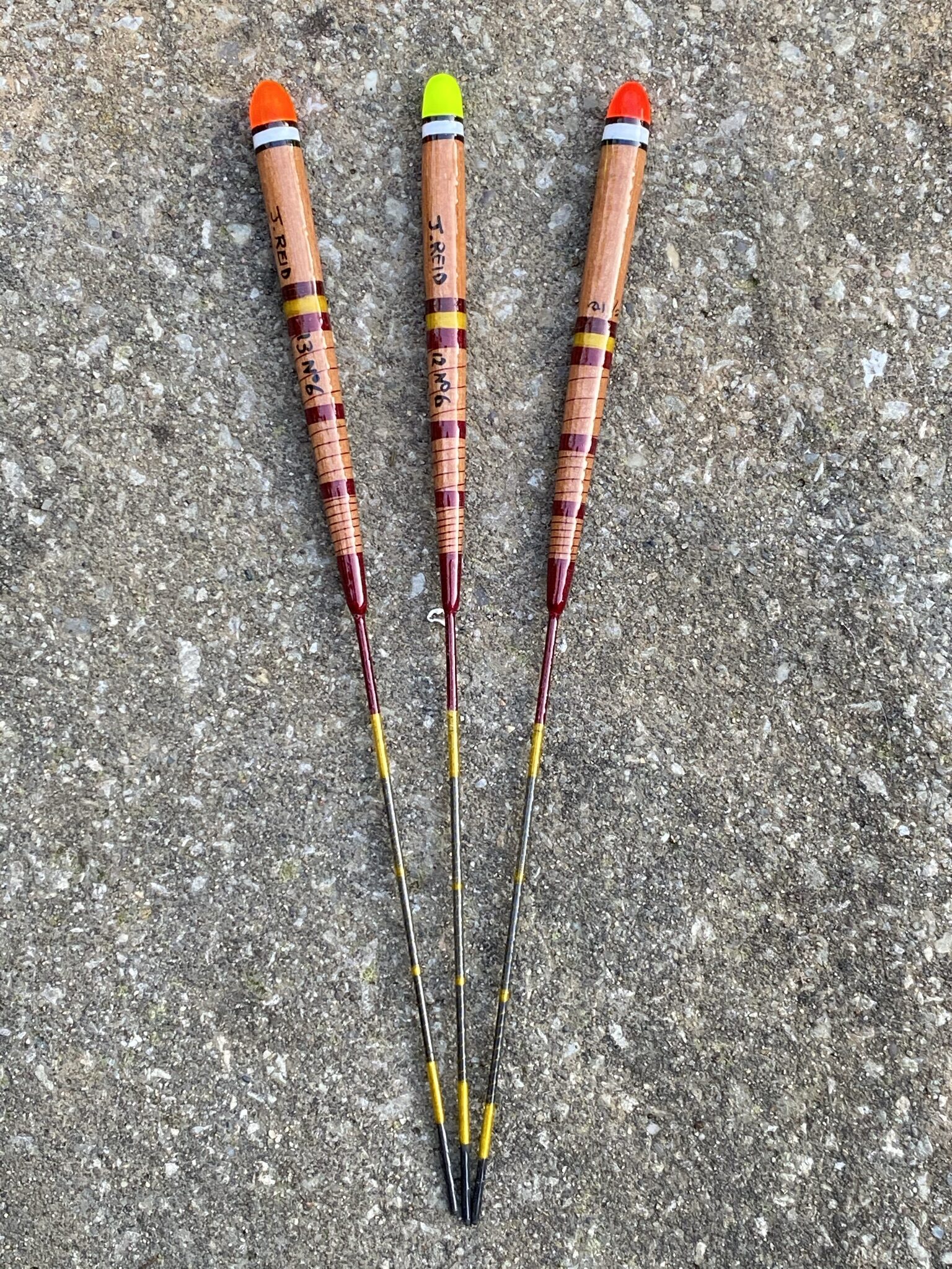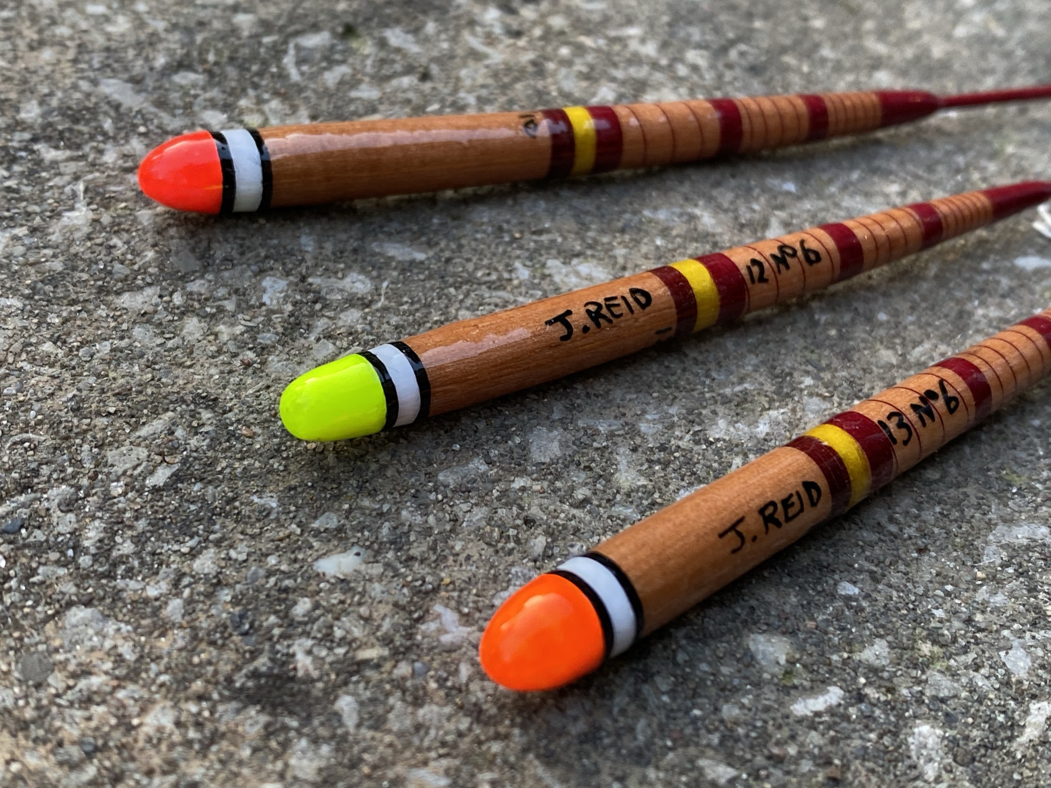 These floats are made from stained Balsa bodies and carbon rod stems; the tips have been painted fluorescent red, yellow & orange over white. Next, they have been dressed using black, yellow and claret silk thread, finally, they all have a minimum of 10 coats of lacquer.