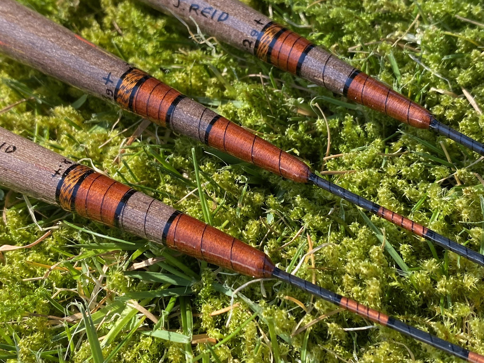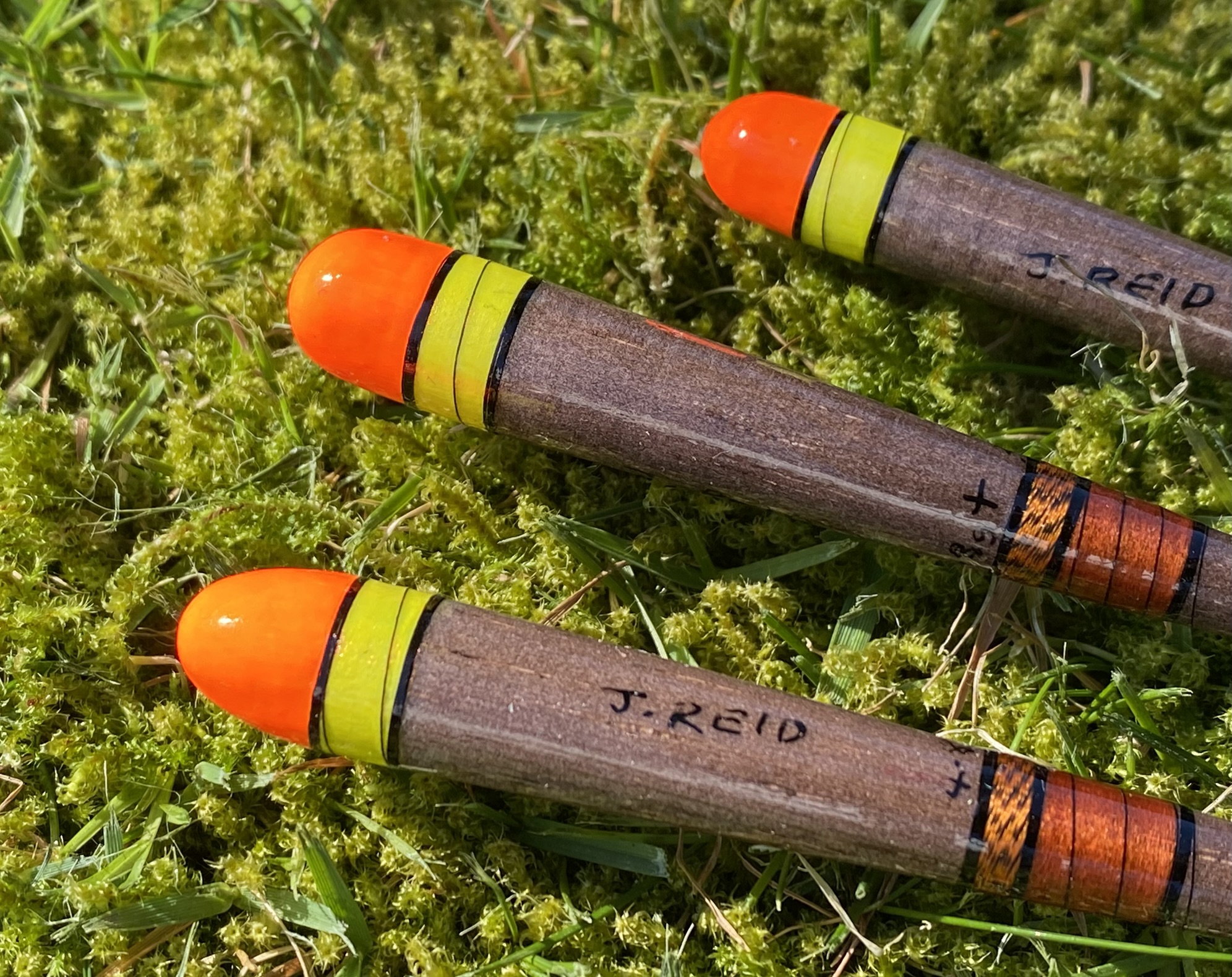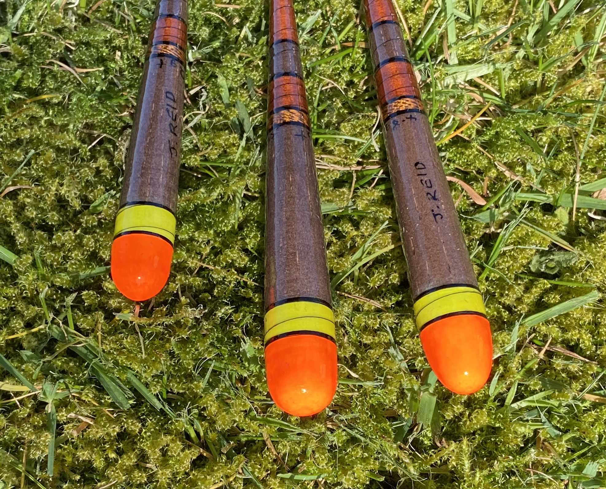 These floats are made from stained Balsa bodies and carbon rod stems with orange over yellow painted tips. Next, they are dressed and lined using Vintage orange/black Jasper and peach with black silk thread.