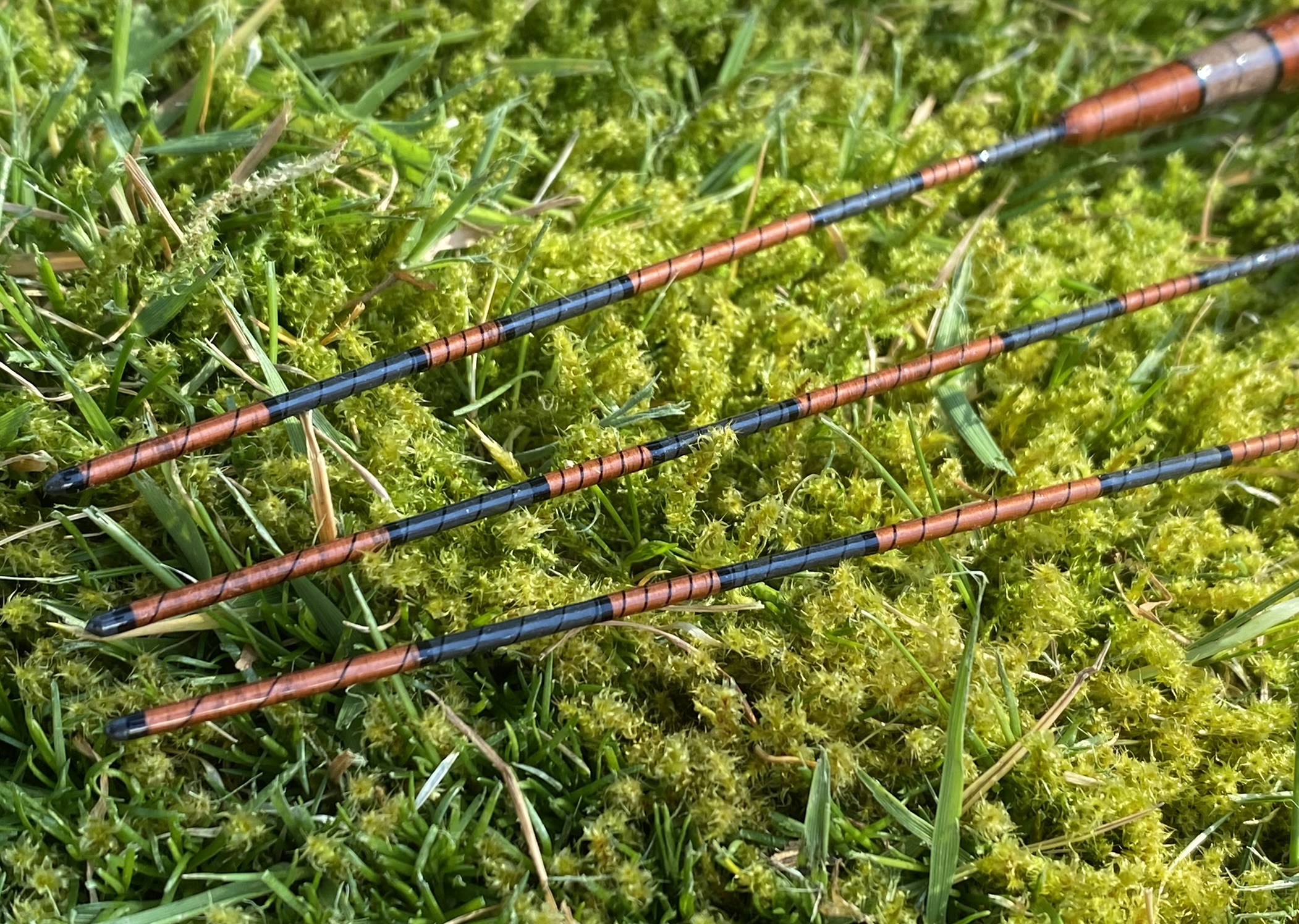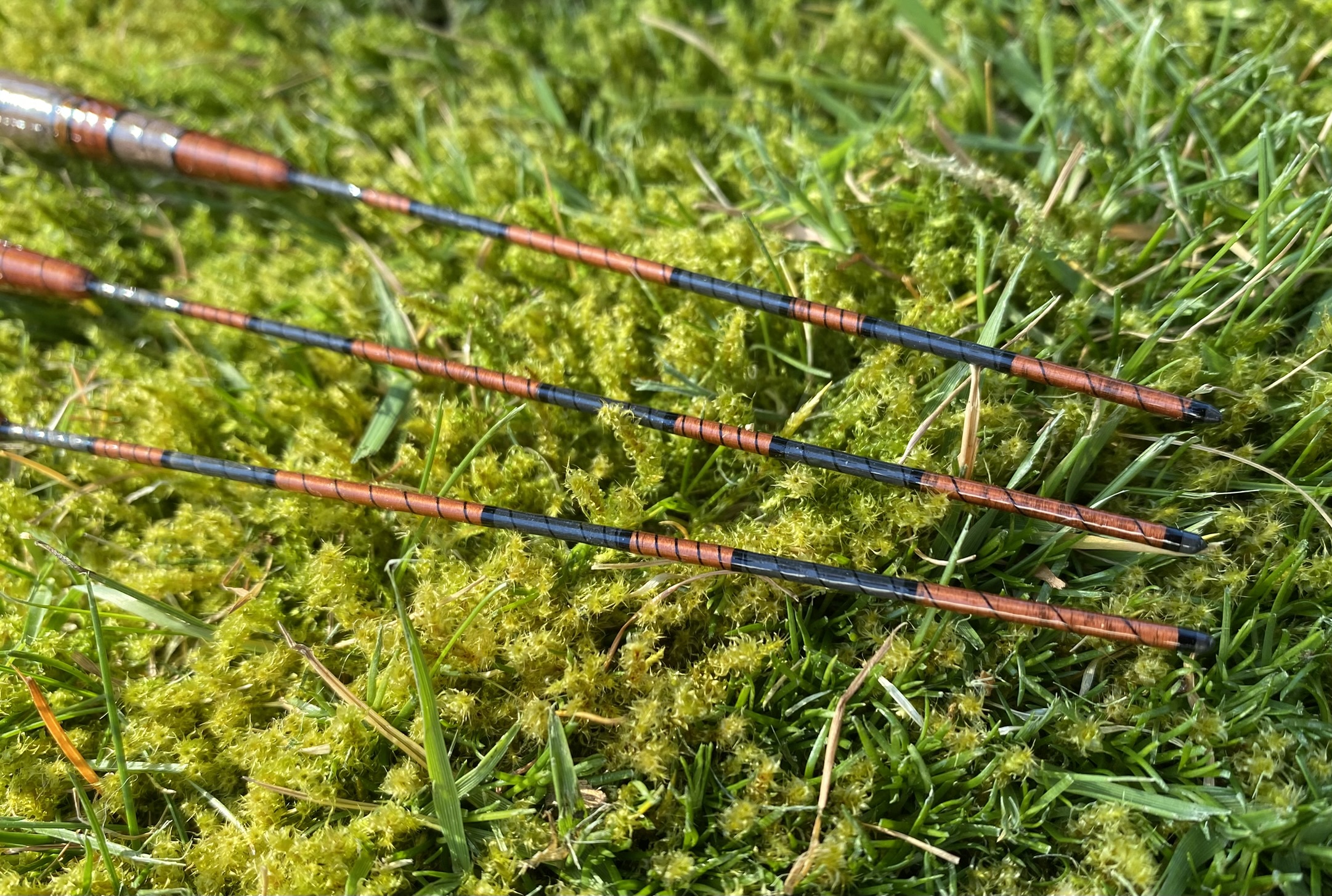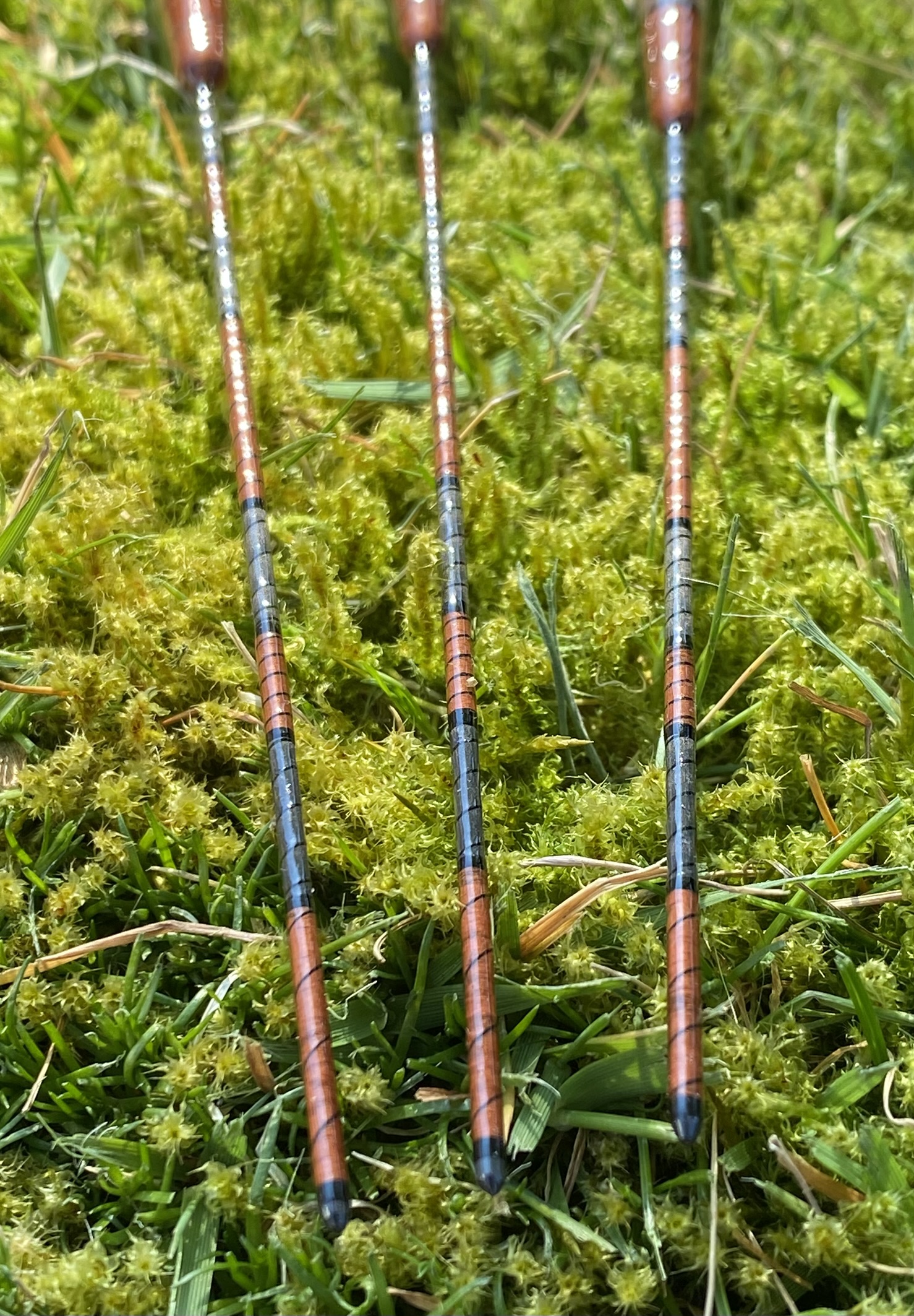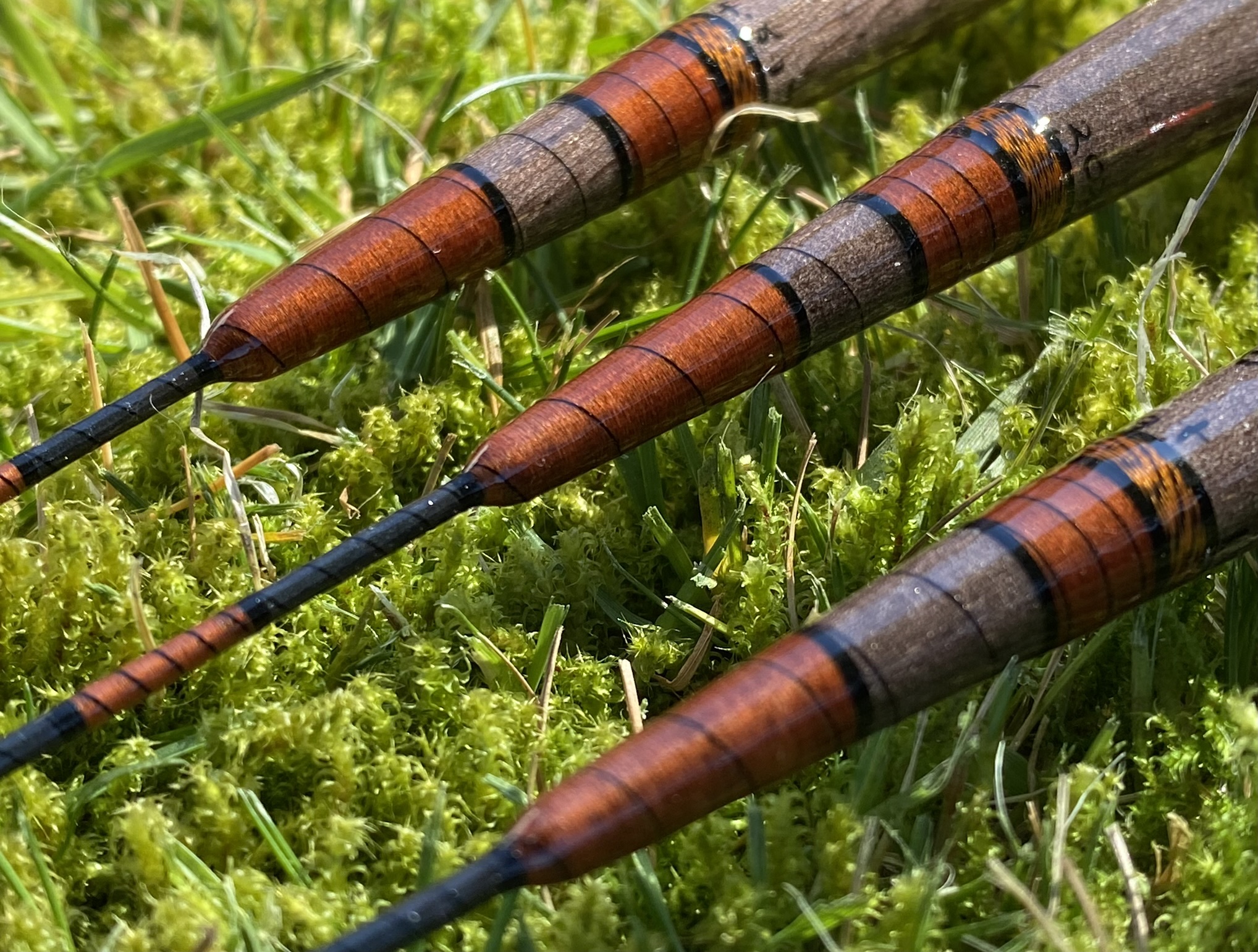 These floats are made from stained Balsa bodies and carbon rod stems with orange over yellow painted tips. Next, they are dressed and lined using Vintage orange/black Jasper and peach with black silk thread.