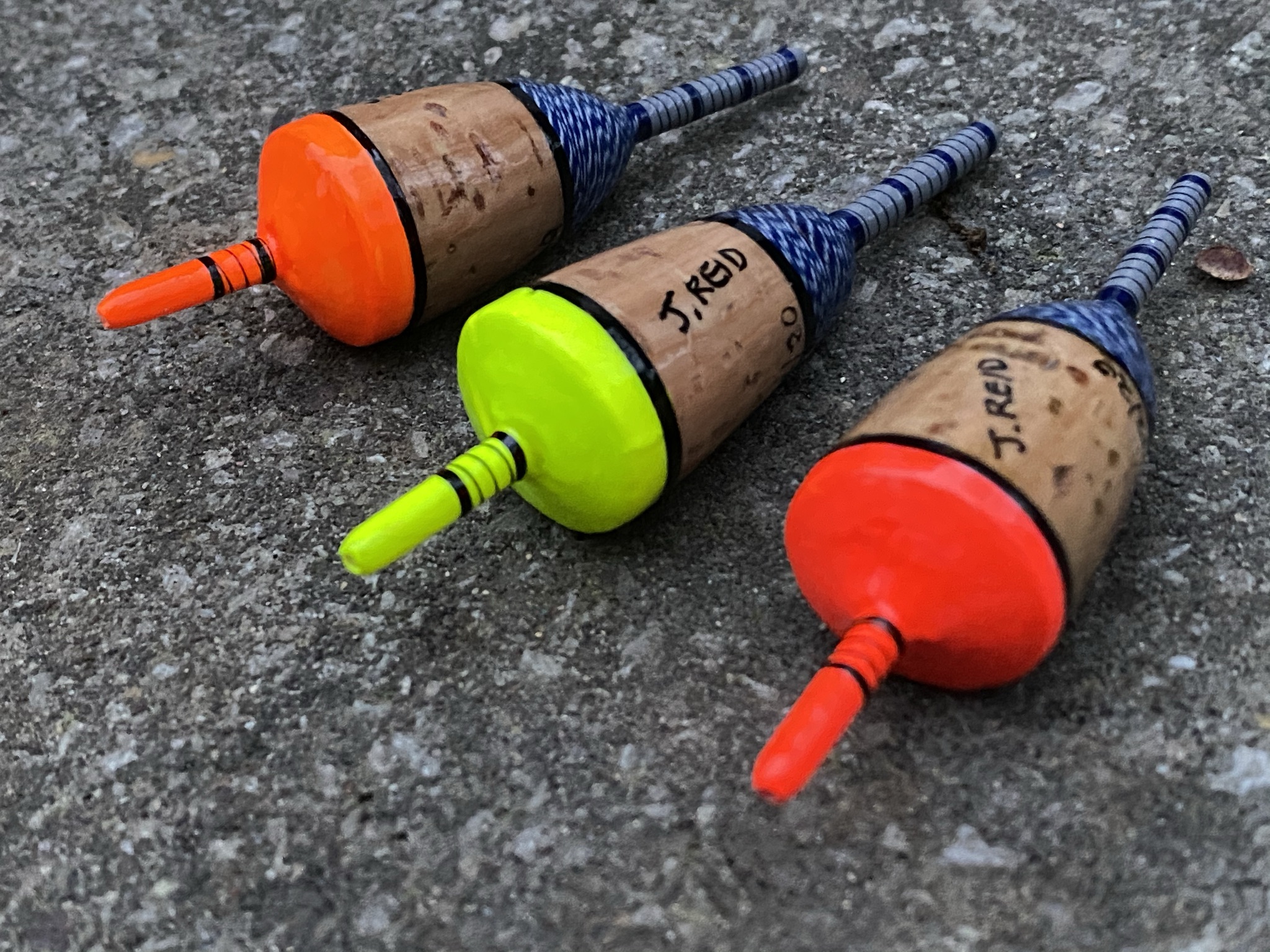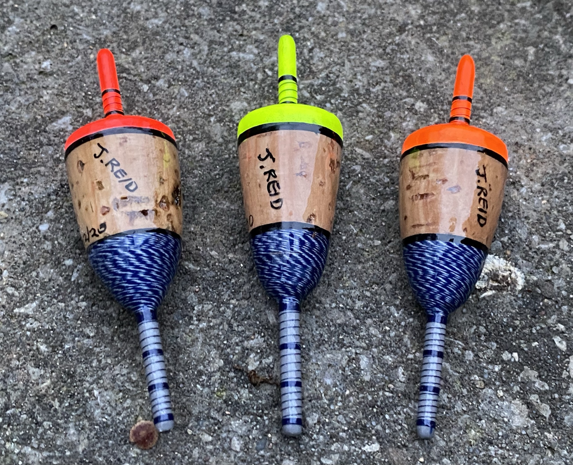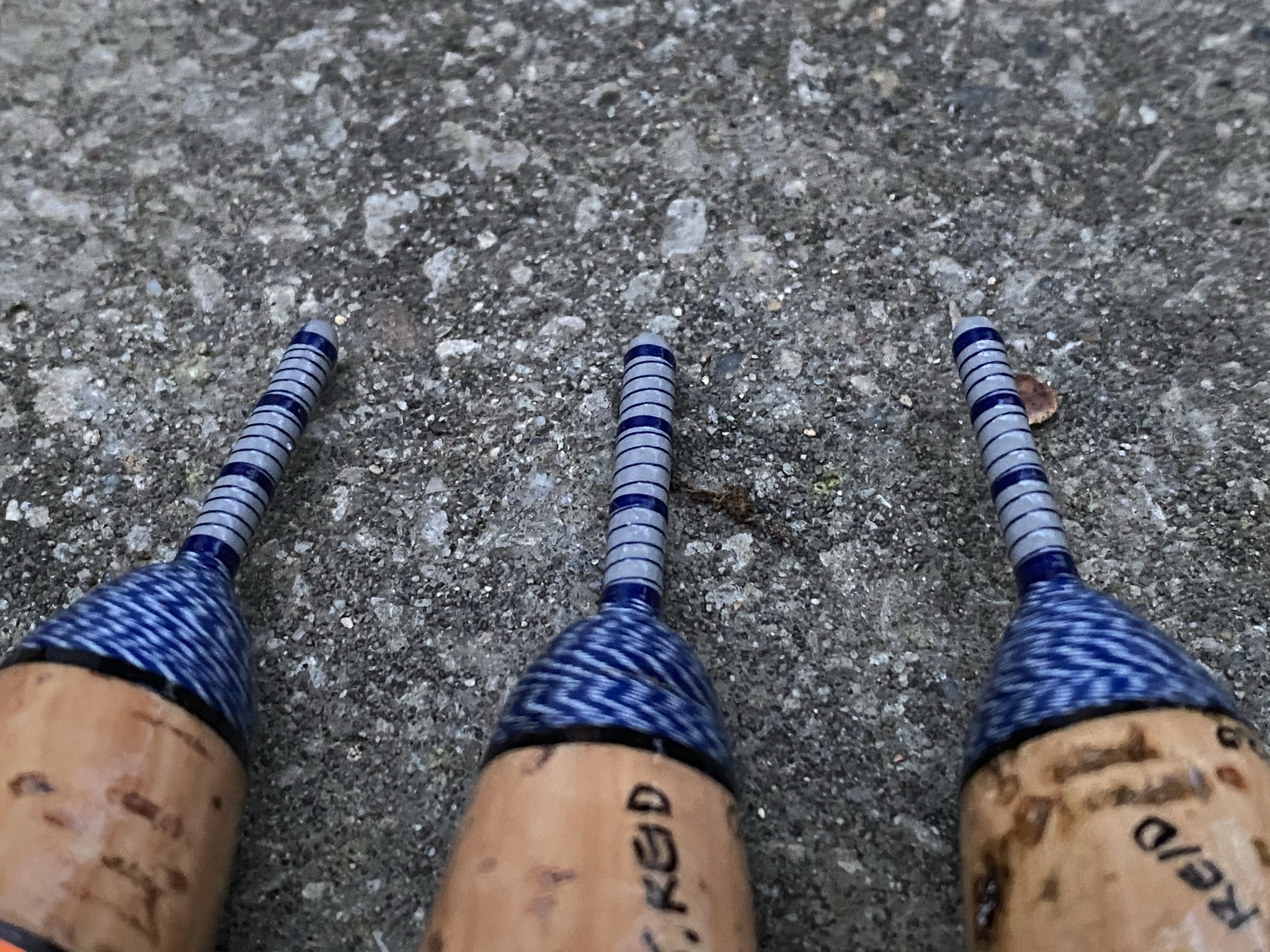 I have made these floats from Cork body’s & crow quill painted tips & stems; next I have dressed them with vintage jasper blue-white, blue and black silk thread. Finally, each have a minimum of 10 coats of lacquer.