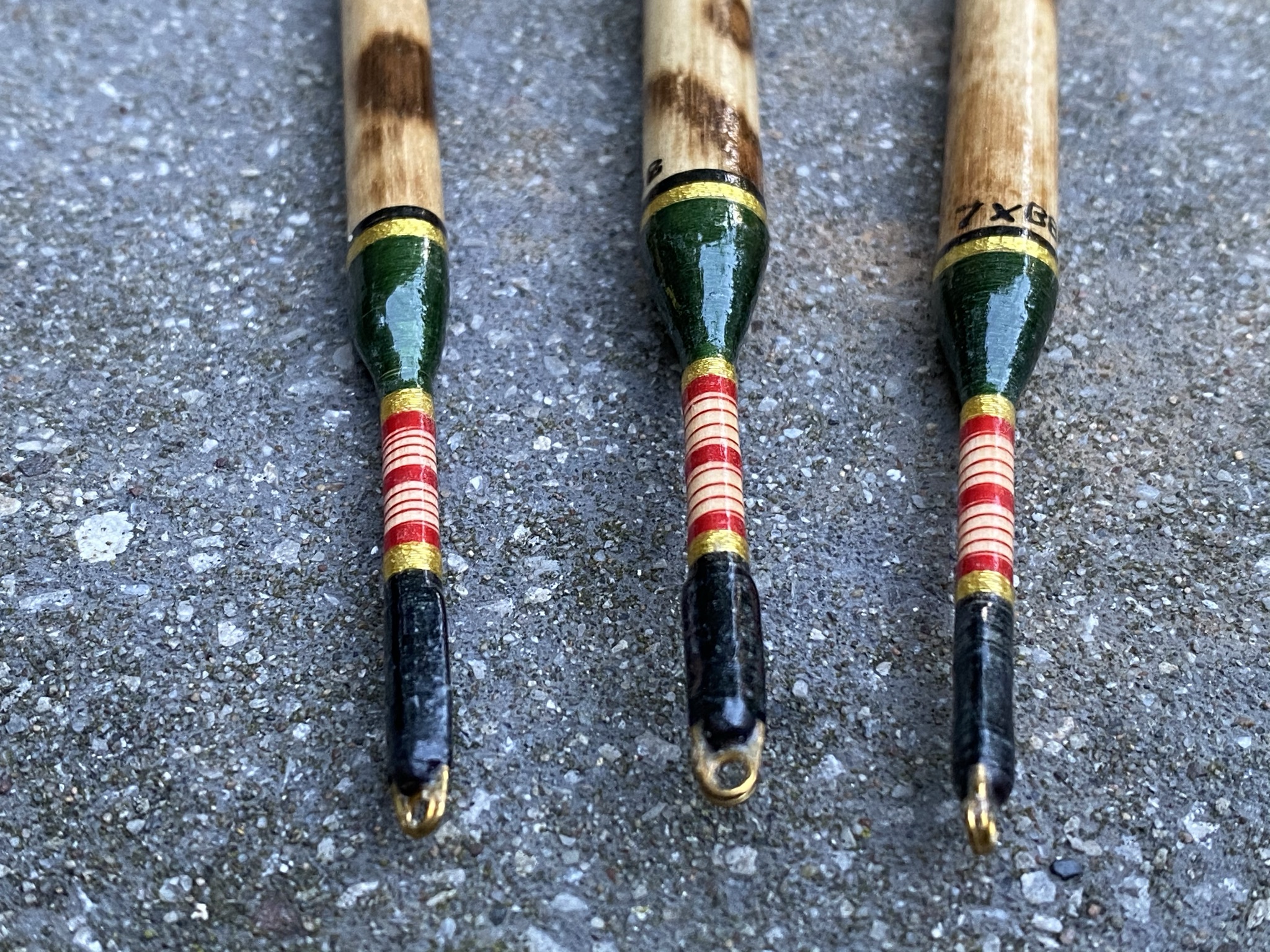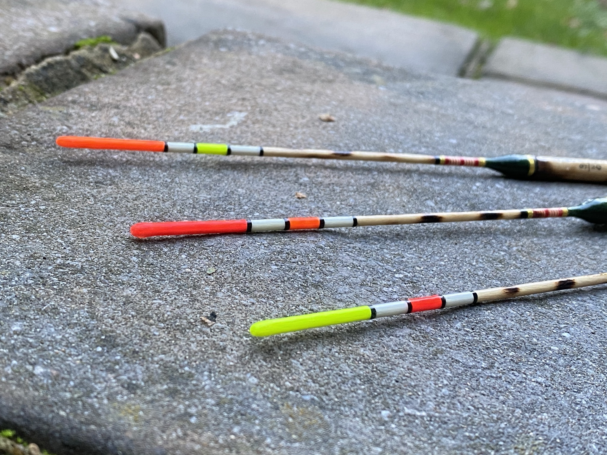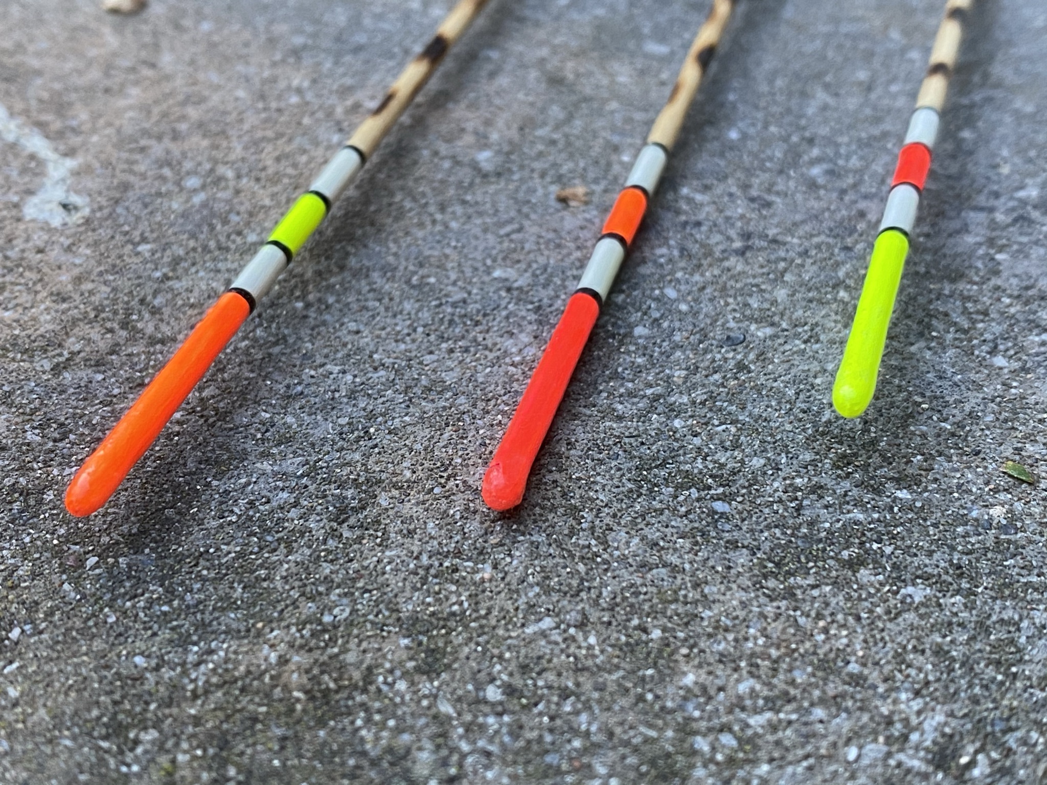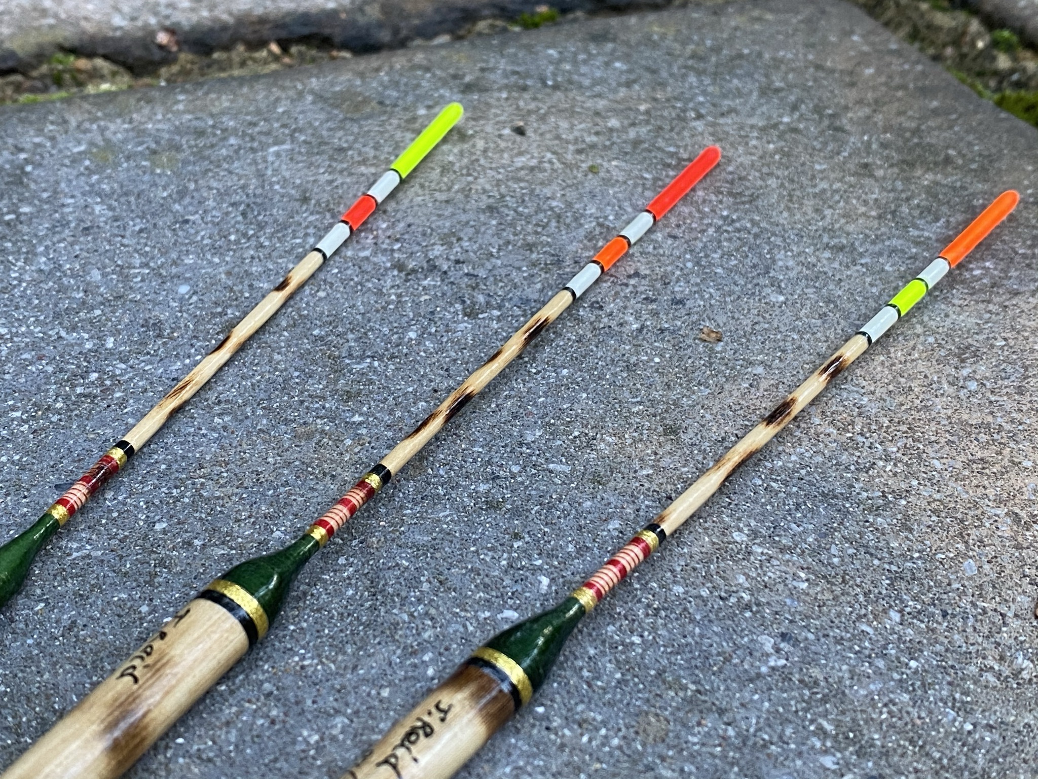 These floats are made using reedmace for the body, cane stems and scorched hardwood dowel with the tips painted: