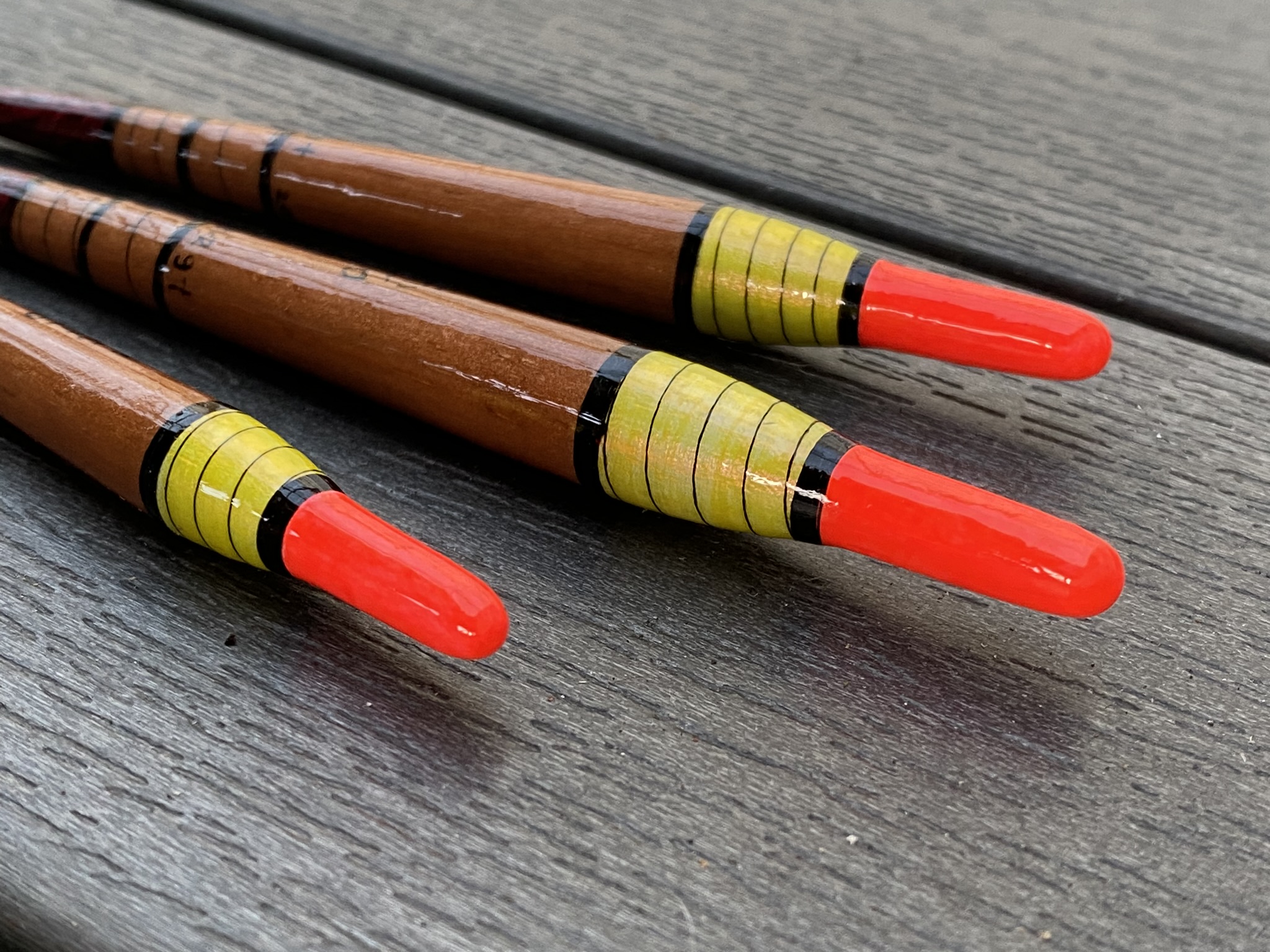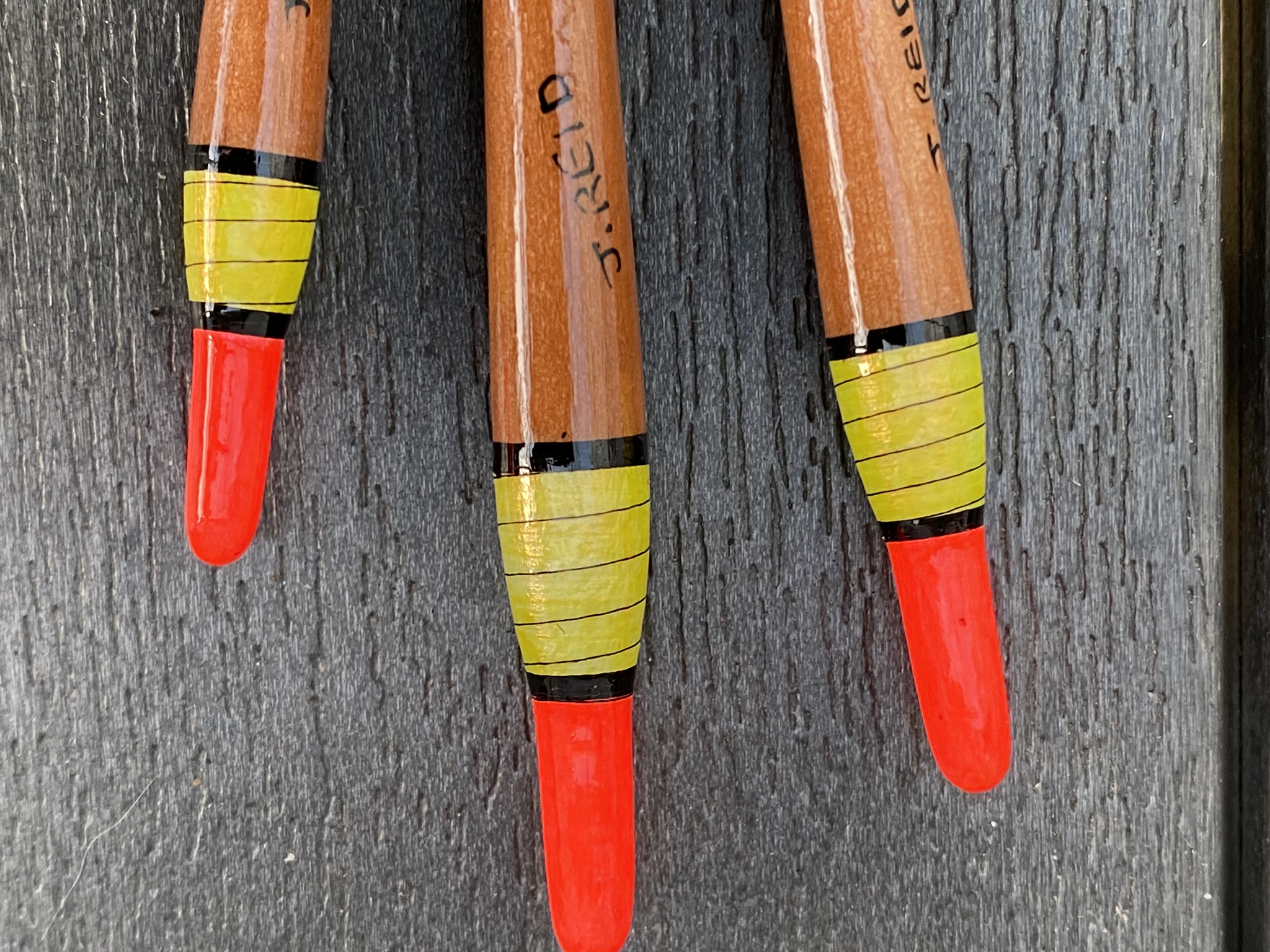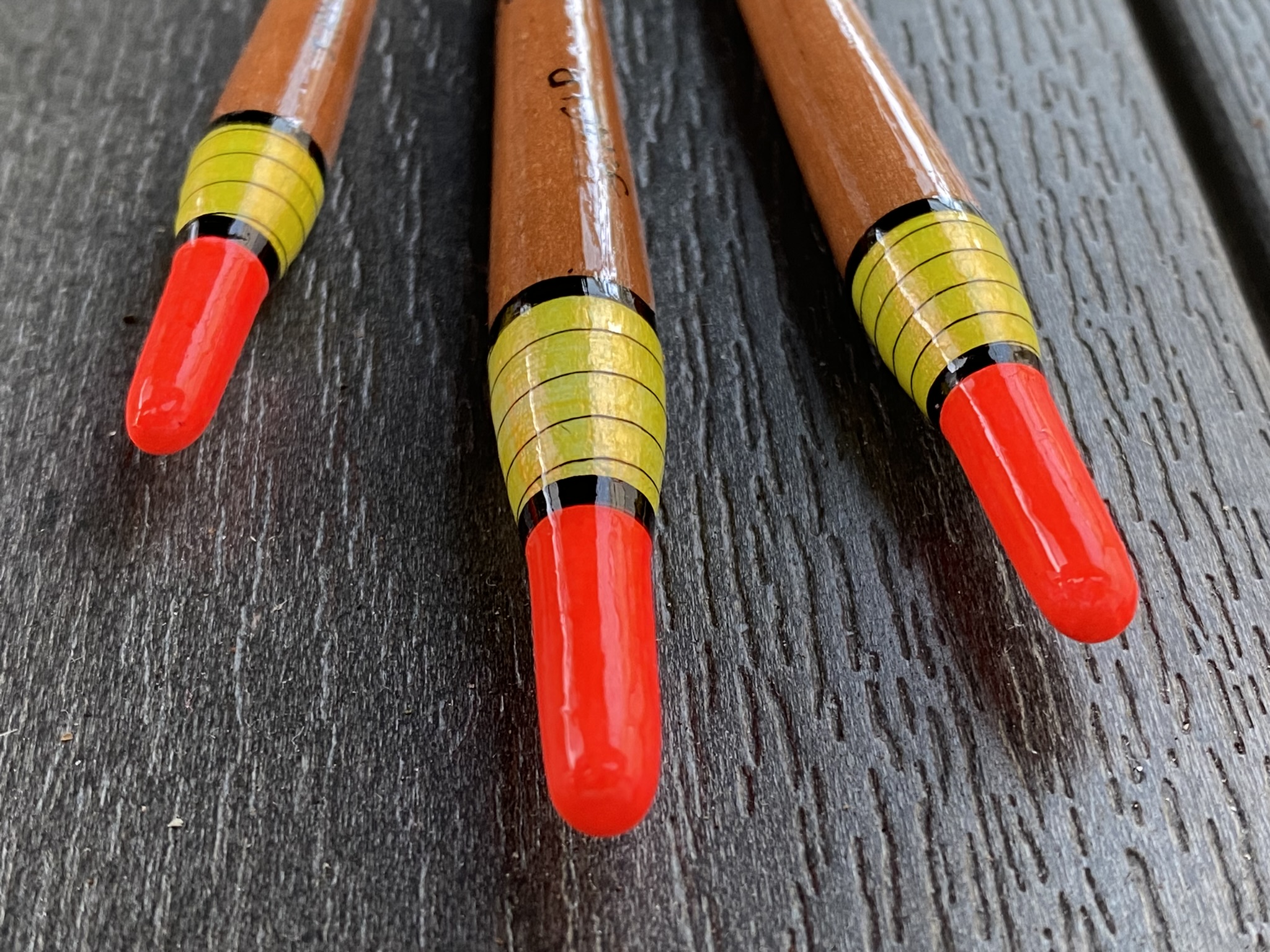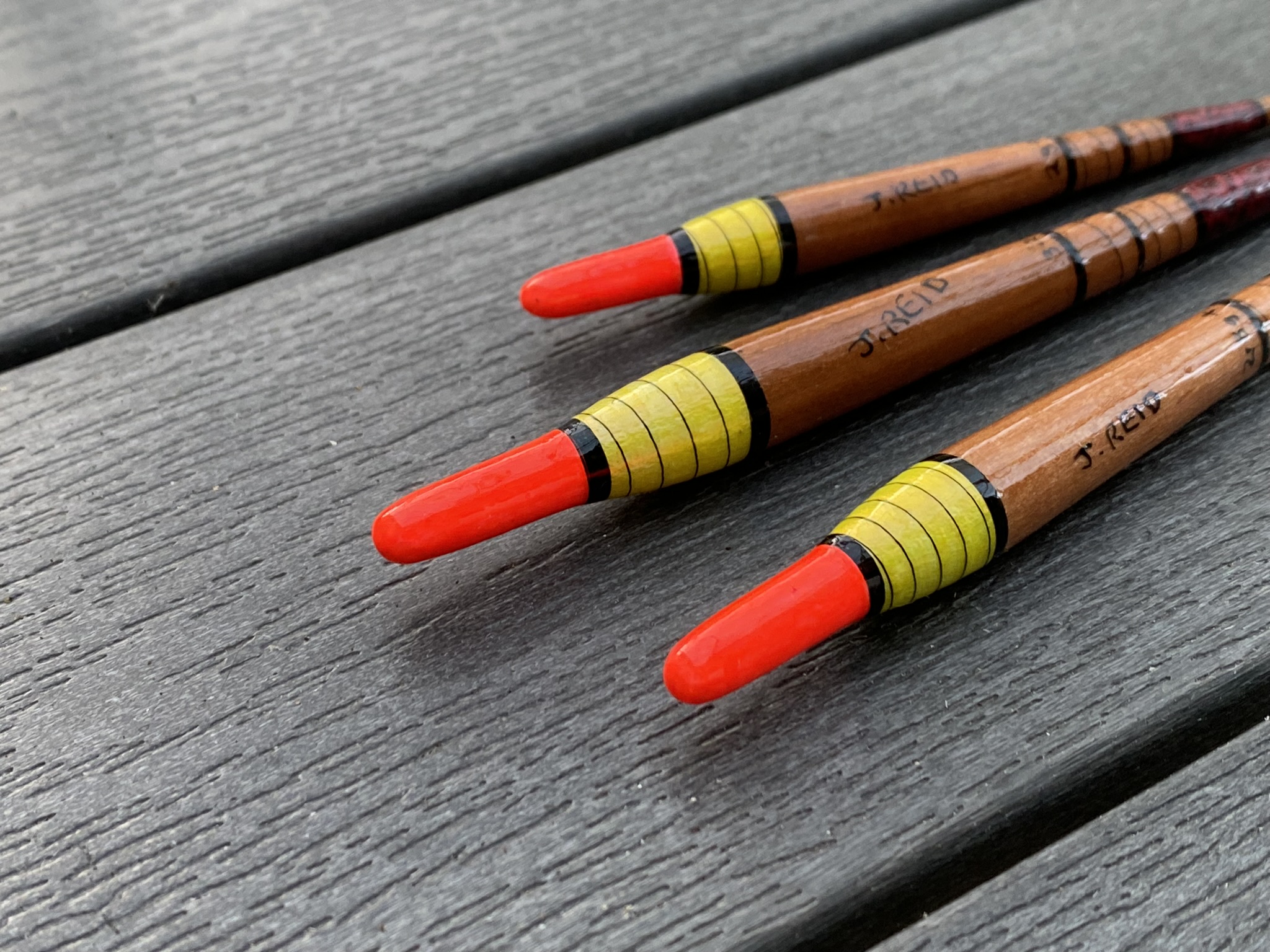 These floats are made from a Balsa body and cane stem, first they are stained, sanded and sealed next the tips are painted red over yellow. They are then dressed and lined using red/black jasper (vintage Gudebrod) and black silk thread. Finally, they all have a minimum of 10 coats of lacquer.