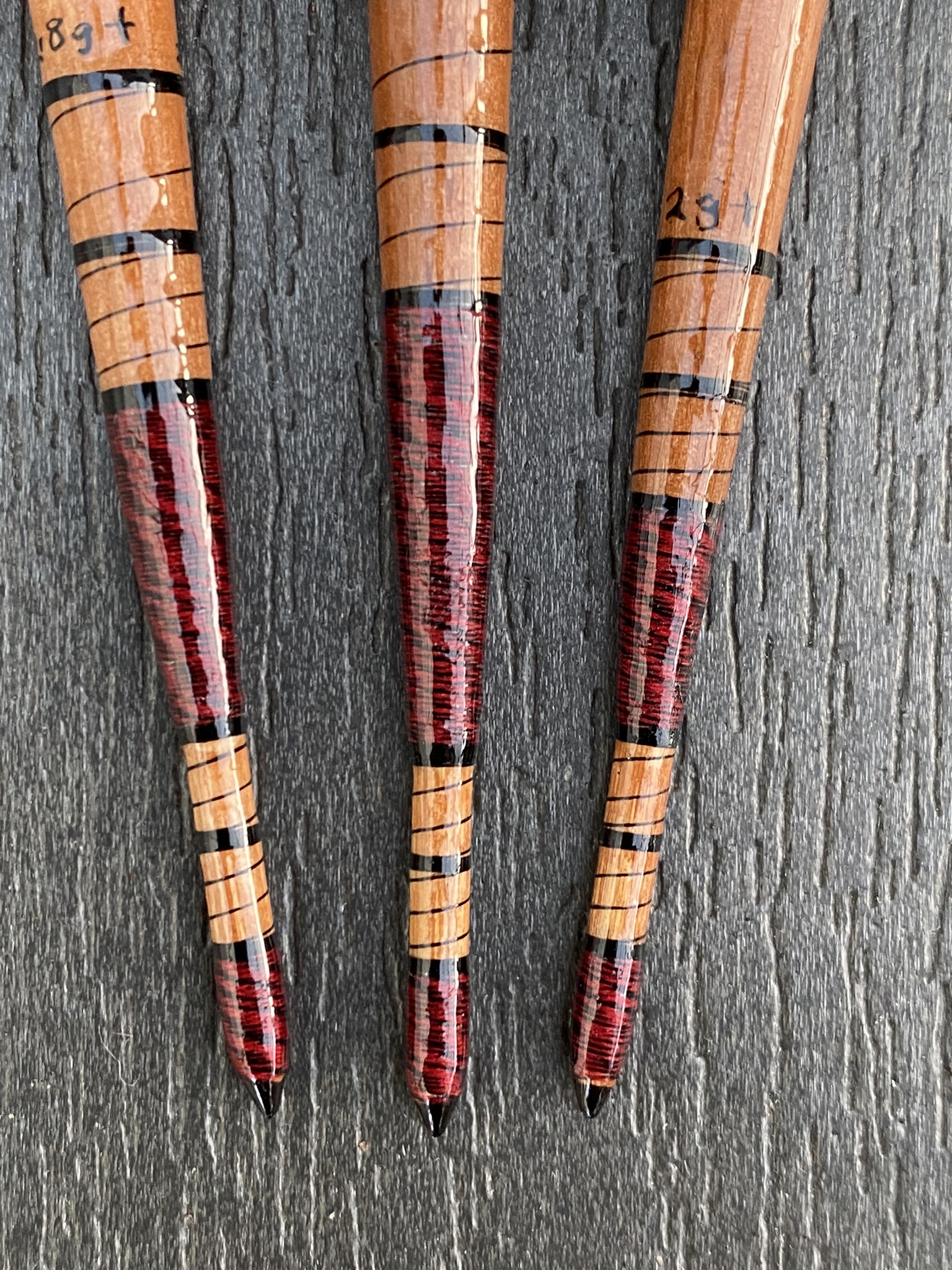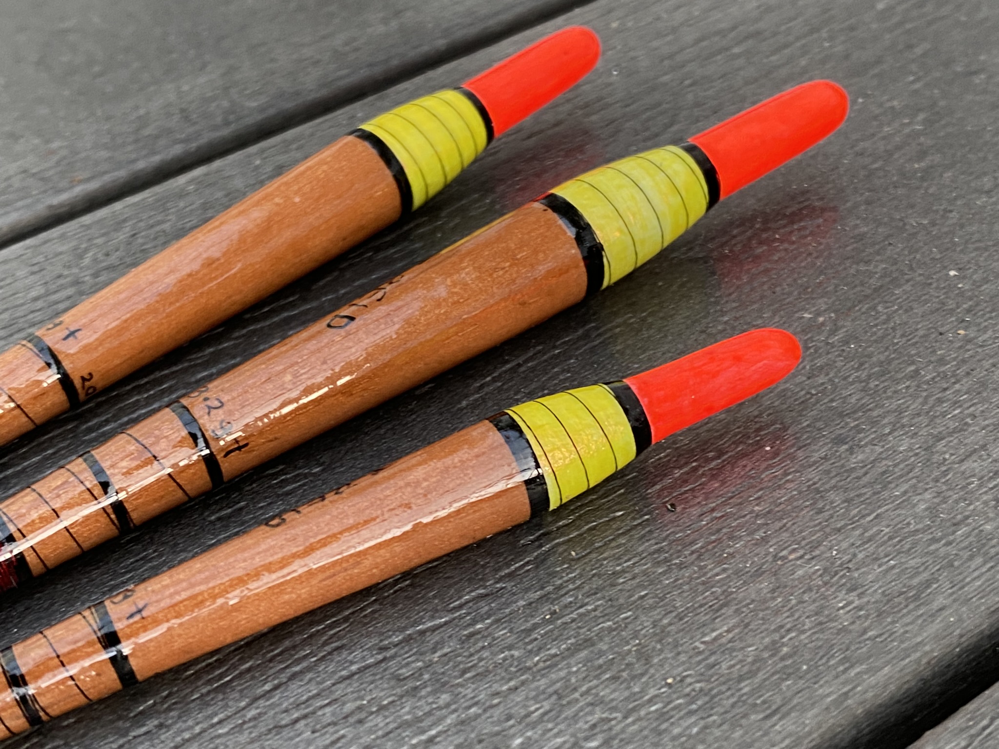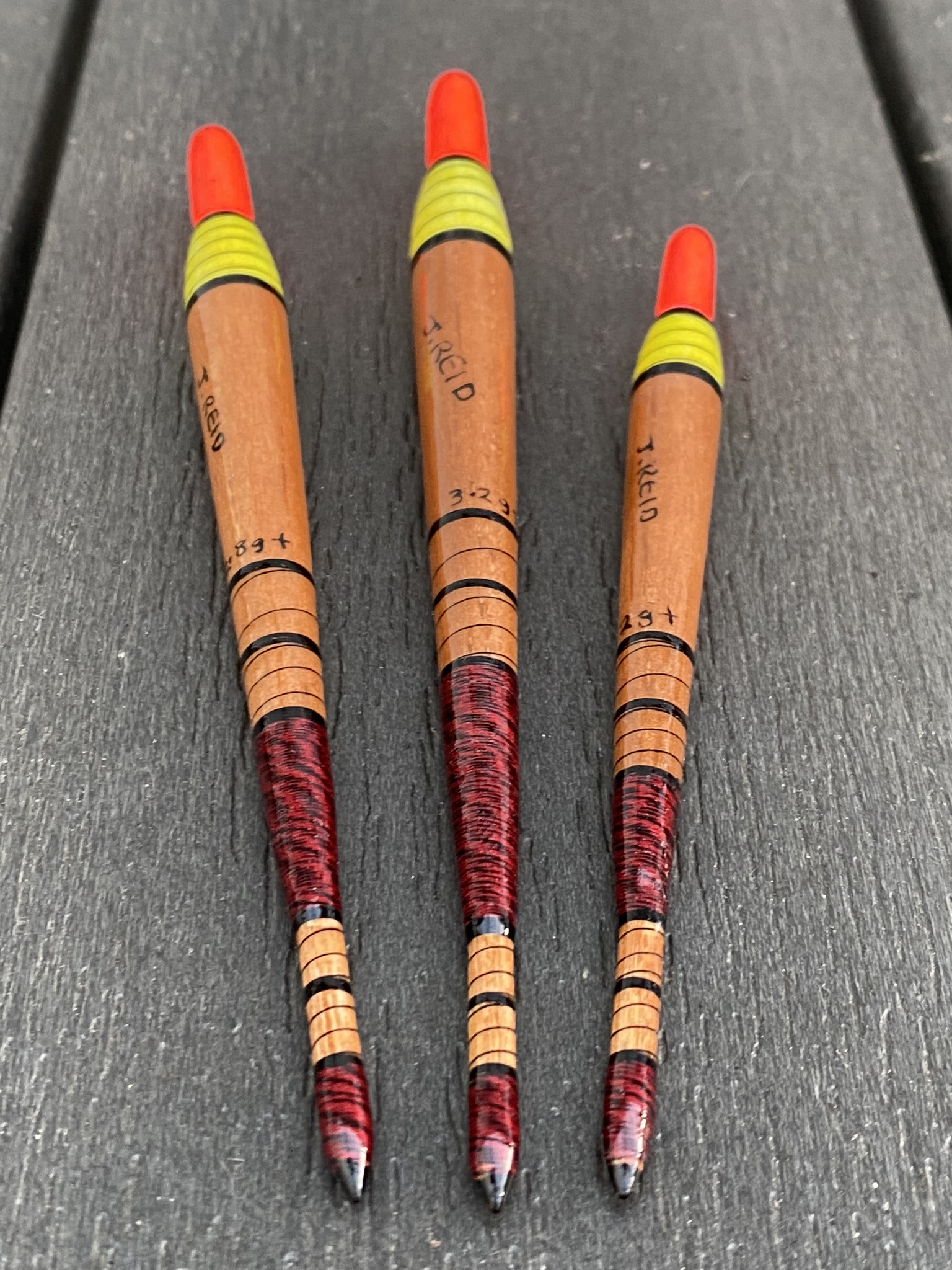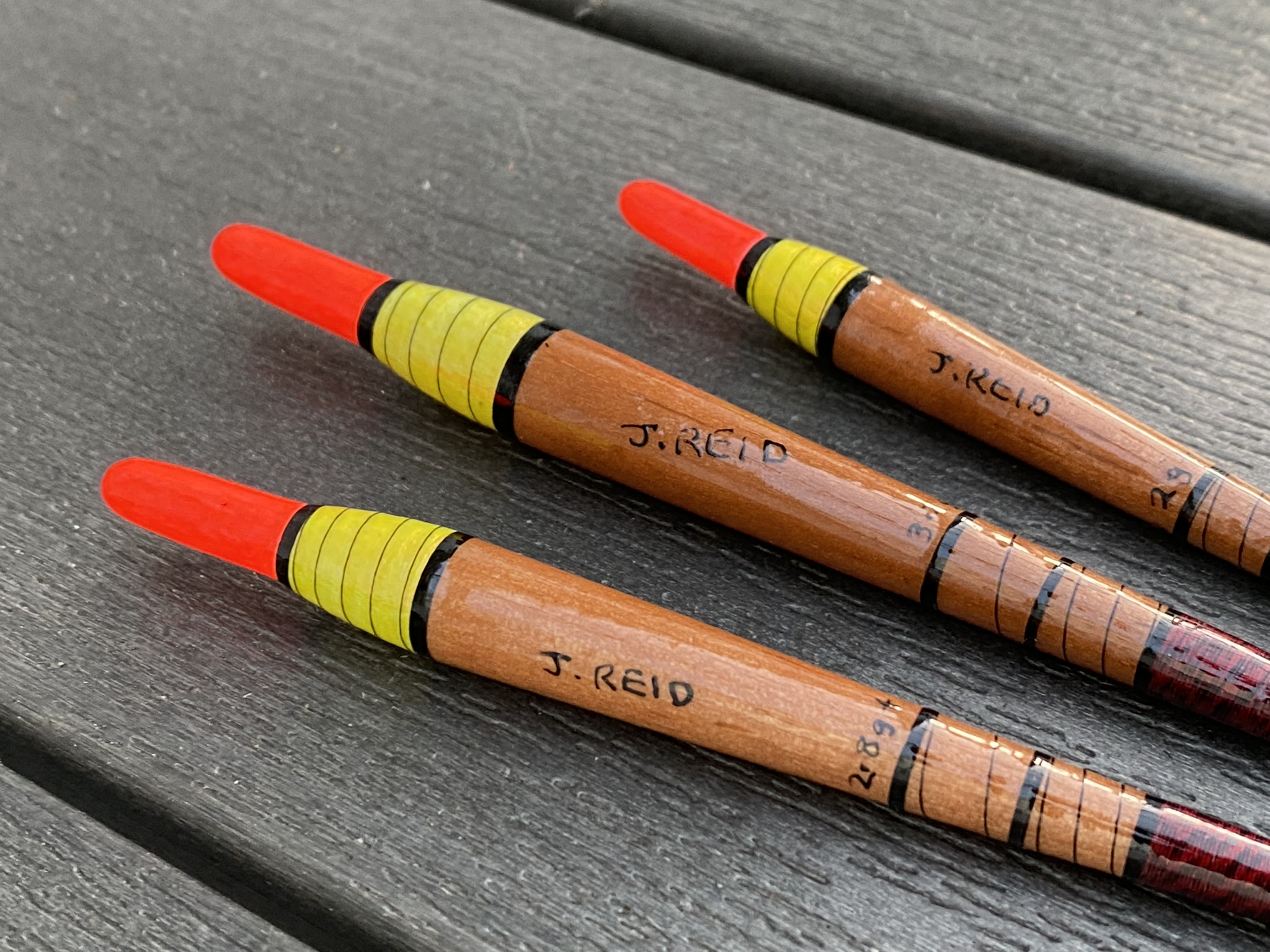 These floats are made from a Balsa body and cane stem, first they are stained, sanded and sealed next the tips are painted red over yellow. They are then dressed and lined using red/black jasper (vintage Gudebrod) and black silk thread. Finally, they all have a minimum of 10 coats of lacquer.