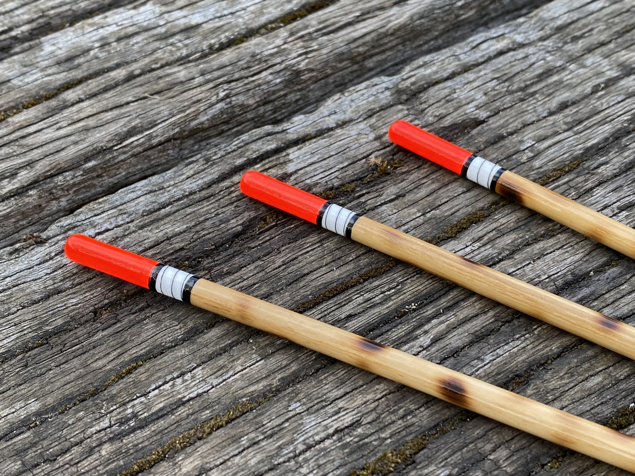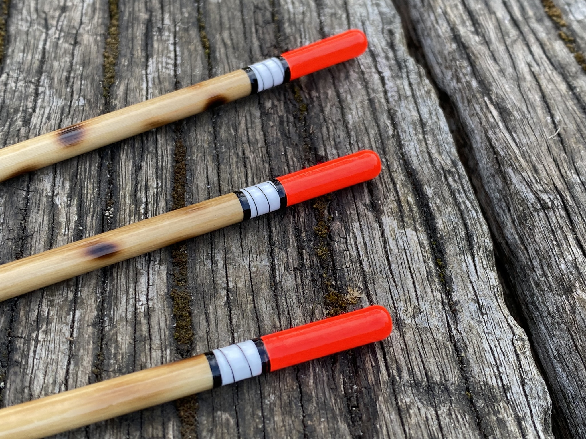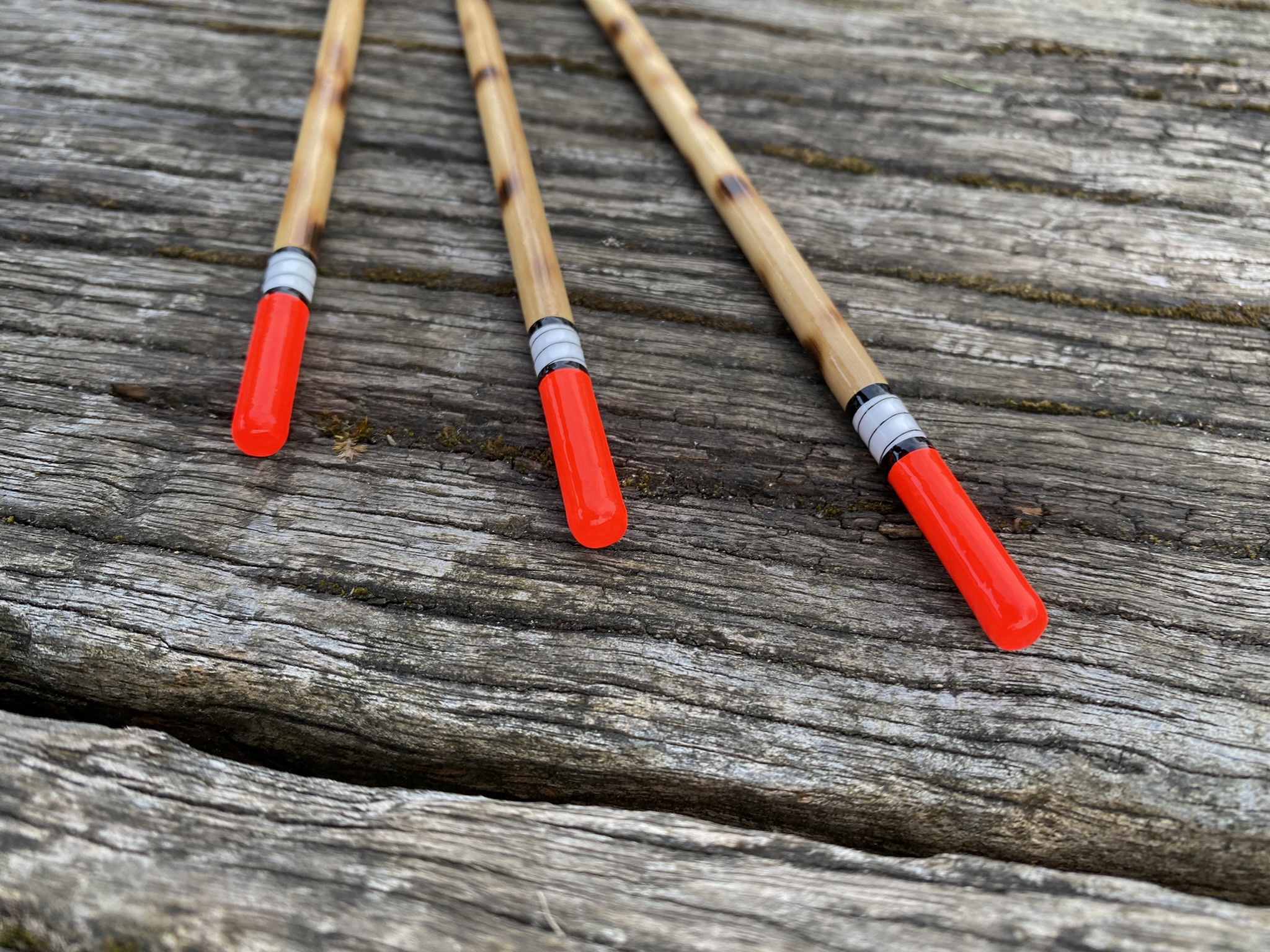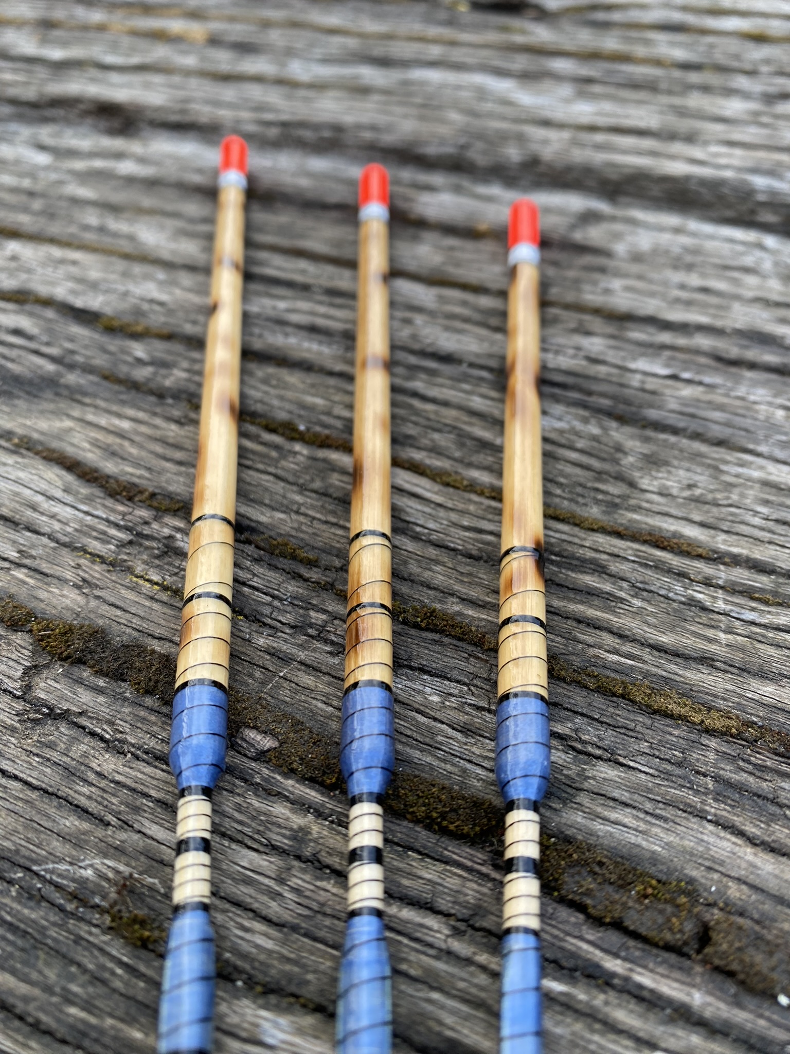 These floats are made from Scorched Sarkanda Reed with a cane stem; the tips have been painted fluorescent red over yellow. Next, I have dressed and lined and whipped the bottom eye on them using sky blue and black silk thread, lastly each have a minimum of 10 coats of lacquer.