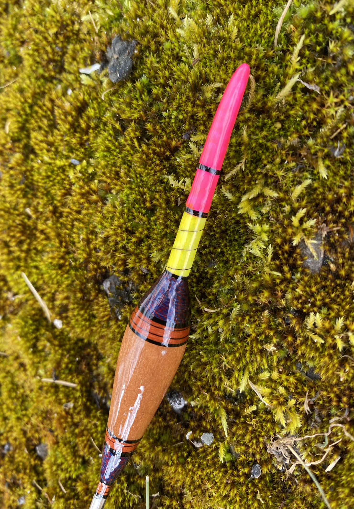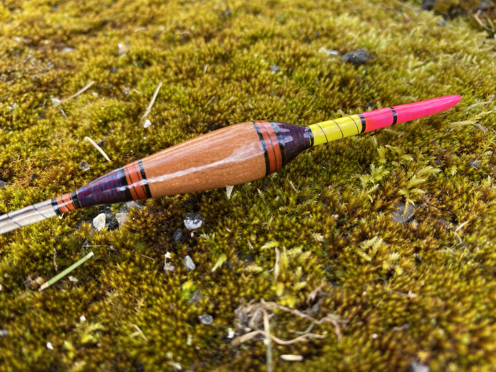 This float is made from a balsa body & Crow quill stems & pink over yellow painted tips, next, next it has been dressed and lined using red/blue jasper (vintage Gudebrod) and peach and black silk thread. Finally, they all have a minimum of 10 coats of lacquer.
